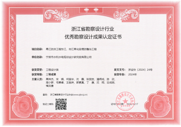 在工程項(xiàng)目方面,獲得2022年度全國優(yōu)秀工程咨詢成果獎、2024年度寧波市優(yōu)秀勘察設(shè)計(jì)獎、2024年浙江省勘察設(shè)計(jì)行業(yè)優(yōu)秀勘察設(shè)計(jì)”綜合類成果獎、寧波市優(yōu)秀水利工程設(shè)計(jì)二等獎、“浙江省文明標(biāo)化工地”稱號、“2024年度寧波軌道交通市域鐵路工程立功競賽先進(jìn)集體”等各類獎項(xiàng)十余項(xiàng)。