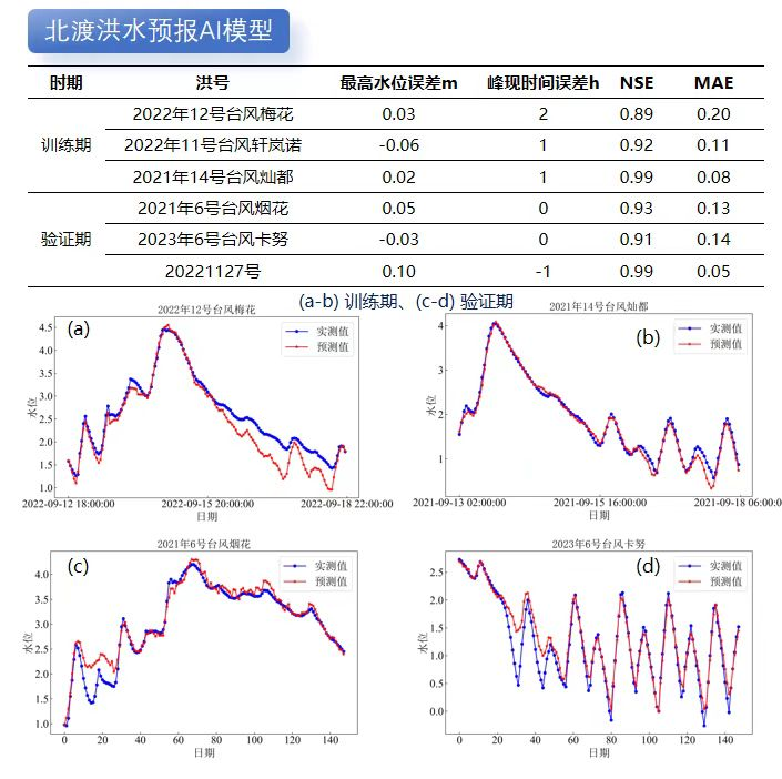 利用成熟水利專(zhuān)業(yè)模型模擬計(jì)算不同降雨潮位邊界條件下的洪水過(guò)程數(shù)據(jù),再基于DeepSeek對(duì)海量洪水模擬數(shù)據(jù)成果進(jìn)行模型訓(xùn)練和蒸餾。目前我院已對(duì)北渡、鎮(zhèn)海等重要流域控制站點(diǎn)進(jìn)行了AI洪水預(yù)報(bào)模型訓(xùn)練和精度驗(yàn)證,結(jié)果表明AI洪水預(yù)報(bào)的準(zhǔn)確性不輸傳統(tǒng)水利專(zhuān)業(yè)模型。