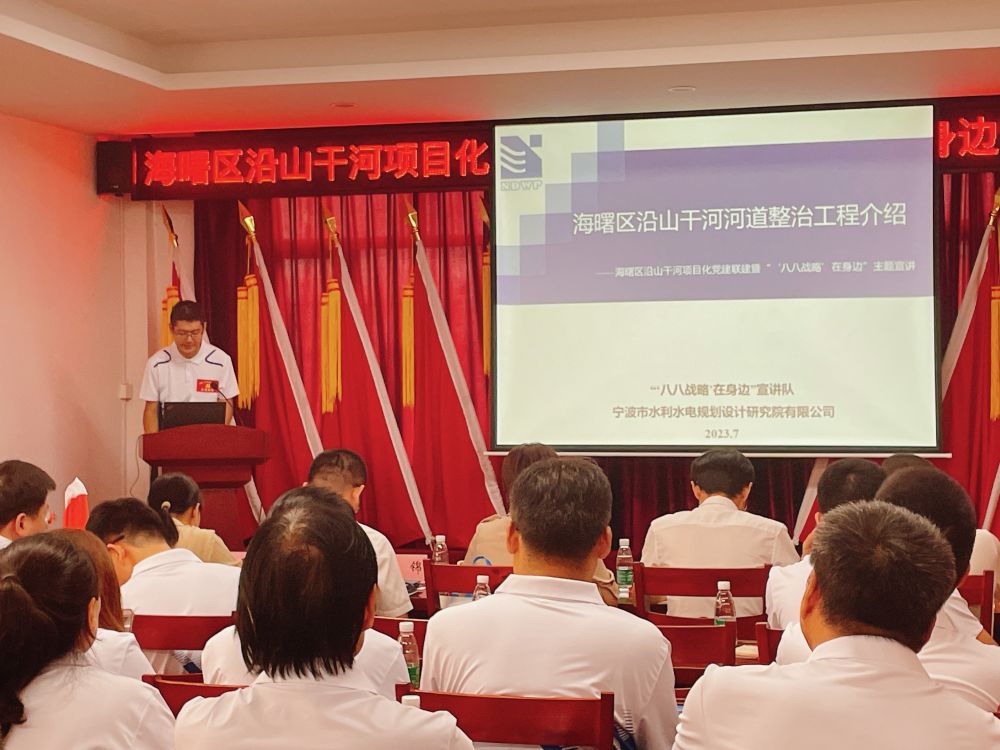 近日,海曙區(qū)直機(jī)關(guān)工委和區(qū)水利局以“五最黨建”為引領(lǐng),在集士港鎮(zhèn)岳童村文化禮堂舉行沿山干河項(xiàng)目化黨建聯(lián)建暨“‘八八戰(zhàn)略’在身邊”主題宣講啟動(dòng)儀式,我院作為沿山干河項(xiàng)目參建單位、活動(dòng)的承辦方參與了啟動(dòng)儀式。我院黨總支書記、副院長王洪霞,工程設(shè)計(jì)項(xiàng)目組及青年黨員代表十余人參加了上述活動(dòng)。