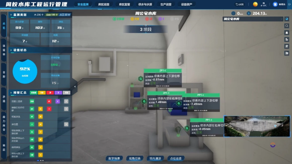 水庫大壩是流域防洪工程體系重要組成部分,是保障水安全的“重器”。數(shù)字孿生周公宅-皎口梯級水庫系統(tǒng)利用高精度模擬仿真引擎1:1構(gòu)建水庫大壩可視化模型和工程安全監(jiān)測分析模型,全面監(jiān)控、深入分析水庫環(huán)境量、變形、滲流、應(yīng)力應(yīng)變、地震等安全要素,逐時(shí)分析大壩的各項(xiàng)安全指標(biāo),直觀展示大壩的安全狀態(tài)。