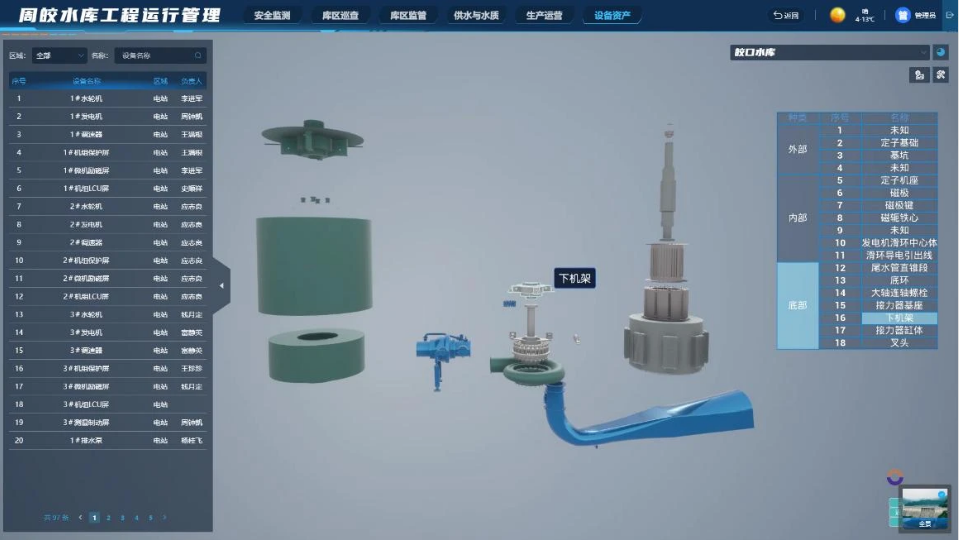 依托BIM仿真建模技術(shù),數(shù)字孿生周公宅-皎口梯級水庫系統(tǒng)實(shí)現(xiàn)了對水庫重要設(shè)備資產(chǎn)的精細(xì)管理。結(jié)合監(jiān)測監(jiān)控?cái)?shù)據(jù),實(shí)時(shí)掌握水庫防洪、供水、發(fā)電的運(yùn)行狀況,保障水庫安全高效運(yùn)行。同時(shí),利用BIM技術(shù)對水輪機(jī)、發(fā)電機(jī)等重要機(jī)電設(shè)備進(jìn)行零部件級的拆解,“再現(xiàn)”設(shè)備的內(nèi)部機(jī)構(gòu)和狀態(tài)。這一技術(shù)幫助水庫工作人員直觀、深入地了解設(shè)備的運(yùn)行原理與機(jī)制,為設(shè)備的精細(xì)管理及維修養(yǎng)護(hù)提供重要支持,也大幅提升了水庫設(shè)備管理的智能化水平。